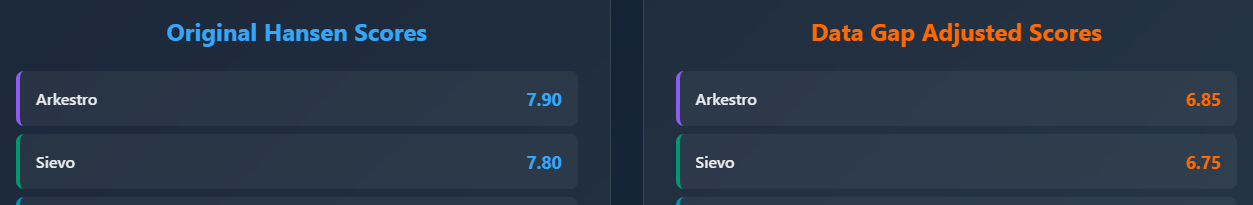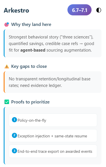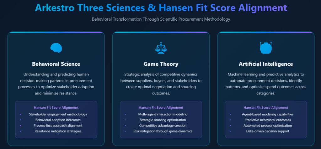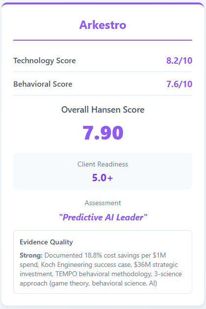 - While Arkestro maintains the highest Hansen Fit Score (7.90) among evaluated providers, the assessment emphasizes that even this leading score carries reduced confidence due to industry-wide data gaps. The methodology validates that Arkestro’s approach is most aligned with behavioral transformation principles, but true validation requires the runtime evidence and retention tracking that Hansen’s methodology uniquely demands—reinforcing why traditional procurement technology assessments consistently miss the behavioral indicators necessary for predicting long-term implementation success.