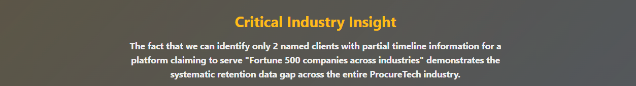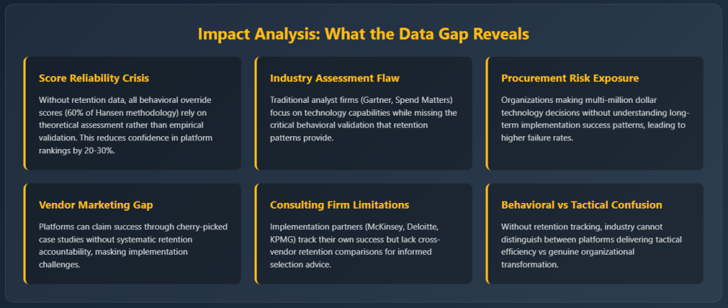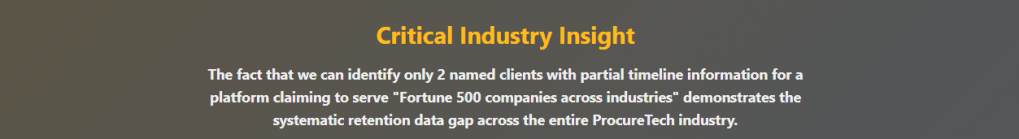 The absence of systematic retention data across the industry reinforces why the emphasis on client retention/loss assessment as a behavioral indicator is not just important – it’s fundamentally necessary for meaningful ProcureTech evaluation.