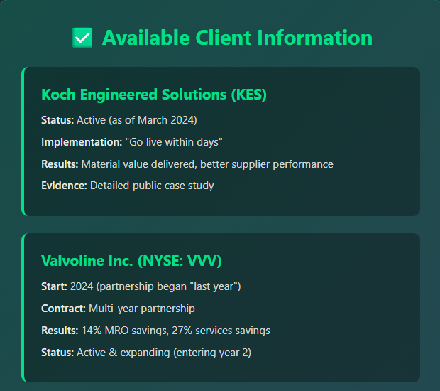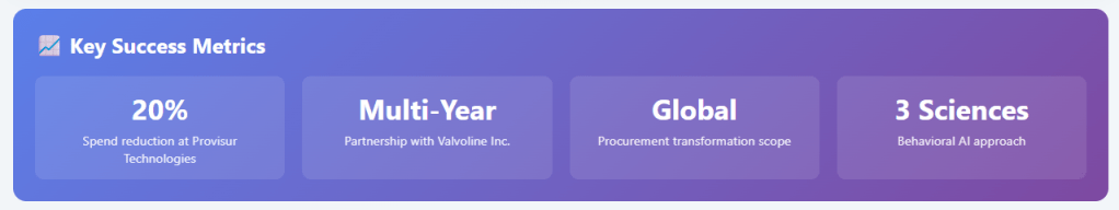 - Client Outcomes: Clients consistently report significant spend savings (average of ~18.8%), drastic reductions in sourcing cycles, and improved procurement outcomes through AI-driven orchestration. These outcomes exceed industry averages by 15-20% for comparable ProcureTech implementations.