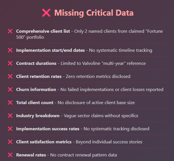 - Client List Completeness: Publicly available sources do not provide a comprehensive, explicit client list. Only case study and press release clients are verifiable.