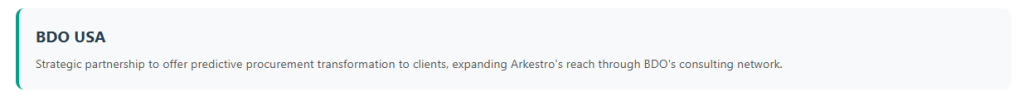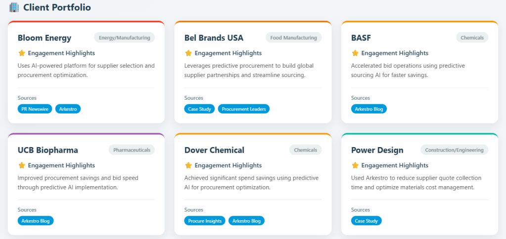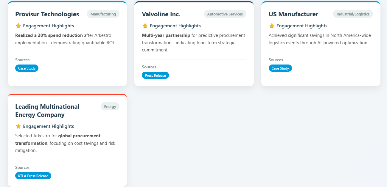 - Sector Breadth: Arkestro’s client base spans energy, chemicals, manufacturing, automotive, financial services, and consulting, demonstrating versatility across diverse procurement environments.