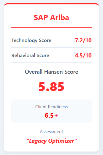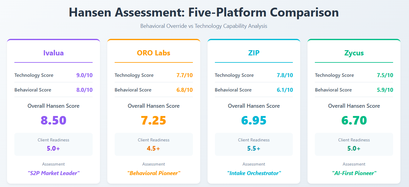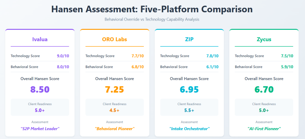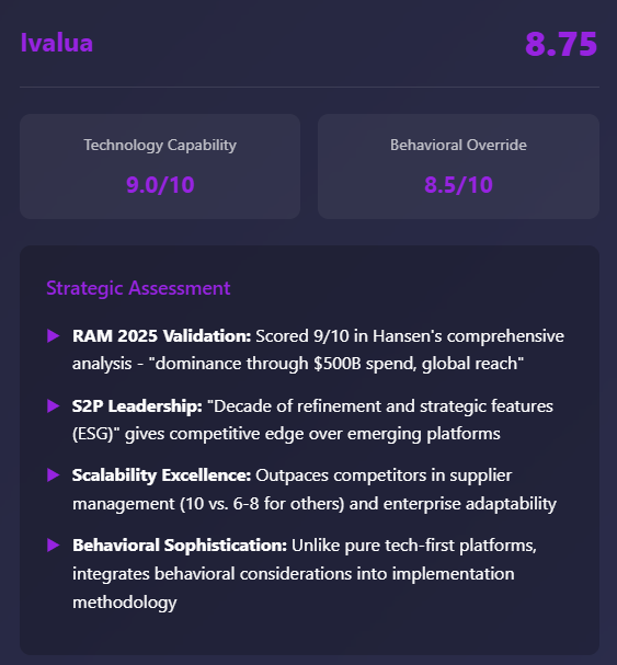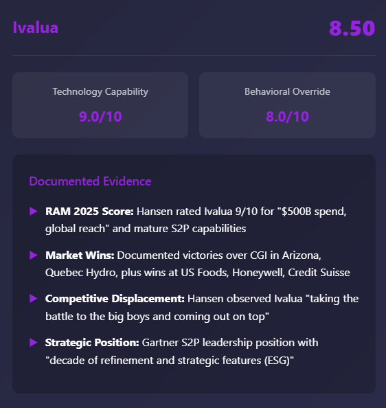 Ivalua Slightly Adjusted: Still leads based on documented market wins and Hansen’s RAM 2025 rating, but the behavioral score has been reduced from 8.5 to 8.0 to be more conservative.