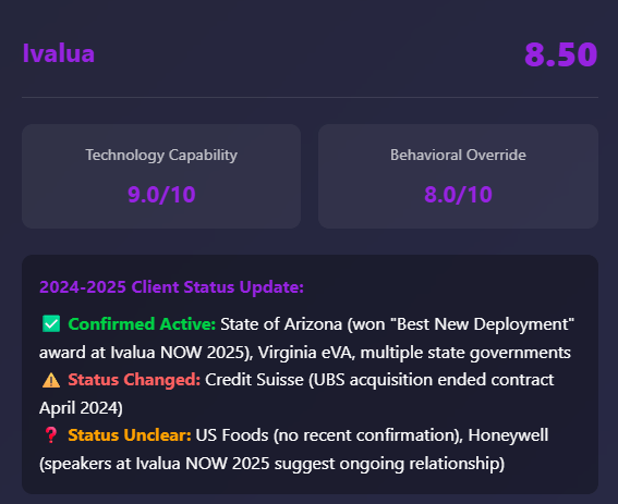 Ivalua’s score remains 8.50 – The client verification actually strengthens the behavioral assessment because: