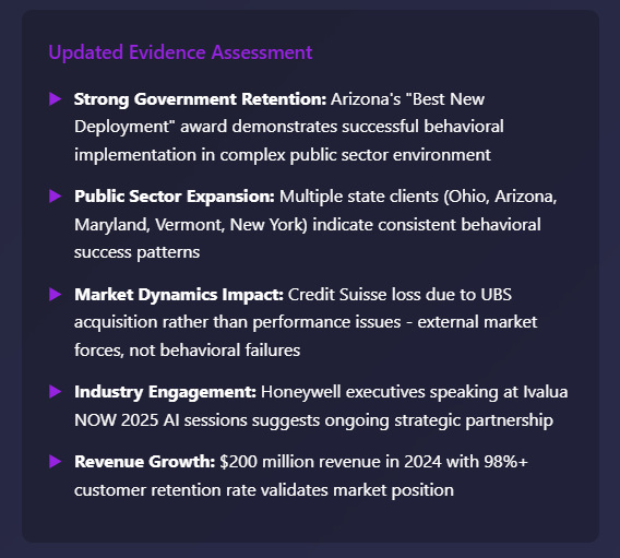 The client verification supports, rather than undermines, Ivalua’s leading position, as the evidence shows successful behavioral patterns (awards, government retention) rather than failures (implementation problems, client dissatisfaction).