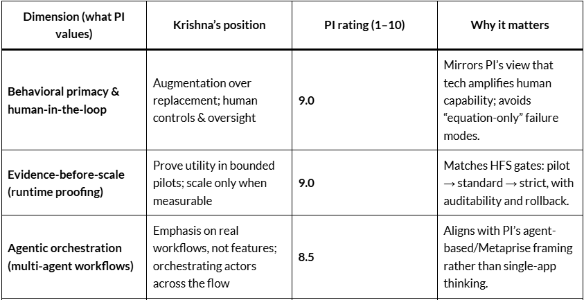 Overall alignment: 8.6 / 10 (Strong) Krishna’s message—start in low-risk domains, prove value with humans in the loop, then scale to mission-critical with tight governance—maps closely to PI’s long-held “people-first, evidence-before-scale” doctrine.