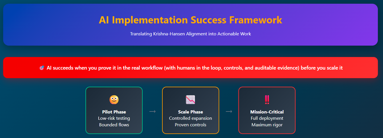 Phased Implementation Methodology: Krishna’s three-step progression (low-risk → medium-risk → mission-critical) mirrors the progressive gates model that Hansen advocates. CEO Outlook 2025: IBM’s Arvind Krishna Advises Customers How to Achieve AI Success – Cloud Wars