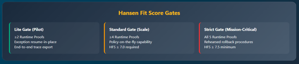 Standard Gate (scale): ≥4 proofs incl. policy-on-the-fly and contextual approvals; HFS ≥ 7.0.