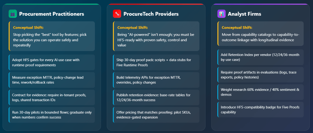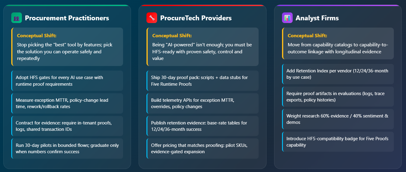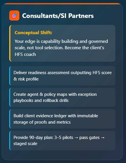 Conceptually: Being “AI-powered” isn’t enough; you must be HFS-ready—prove safety, control and value in the customer’s tenant with human oversight.
