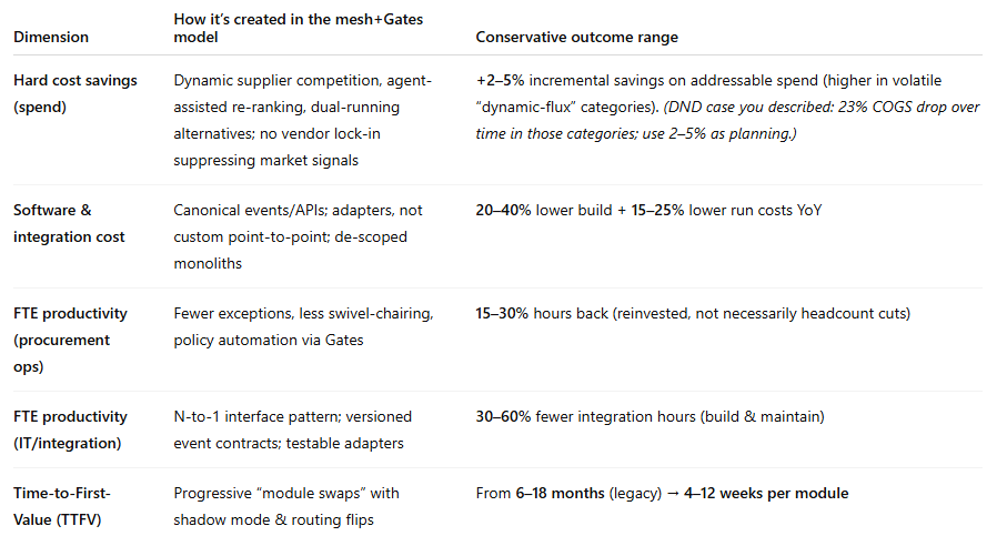 Bottom line: expect double-digit $ benefits in year one with durably lower complexity and switching costs thereafter. The reason is structural: value creation sits in your mesh, contracts, and Gates, not inside any one vendor’s box.
