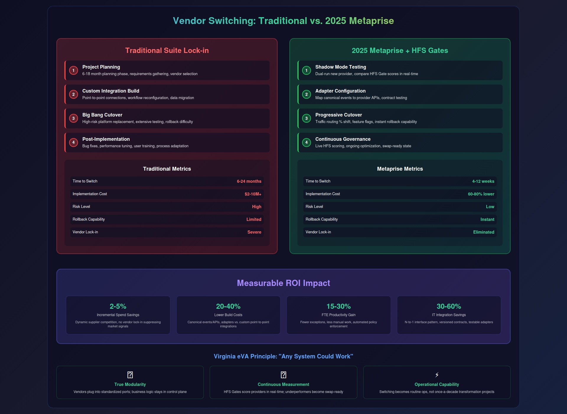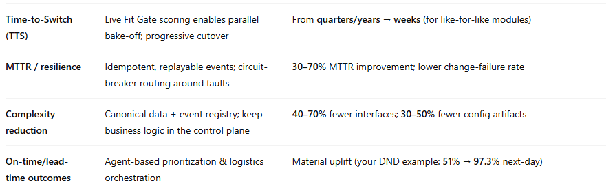Compared to monolithic suites, the mesh/fabric + Fit Gates approach turns a vendor replacement from a risky platform re-implementation into a contained edge swap with measurable guardrails. You won’t get “zero cost,” but you compress the scope to adapters + mappings, validate with live Gate scores, and switch with progressive routing and replay—which is exactly how you reduce both the time and the money it takes to move on from a provider that isn’t delivering.