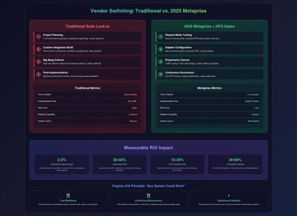 Yes—that’s exactly the idea: true modularity and vendor-agnostic procurement. What Virginia eVA proved (“Ariba worked, but we could’ve succeeded with any system”) is what your 2025 Metaprise + event mesh/data fabric + Hansen Fit Gates operationalize: