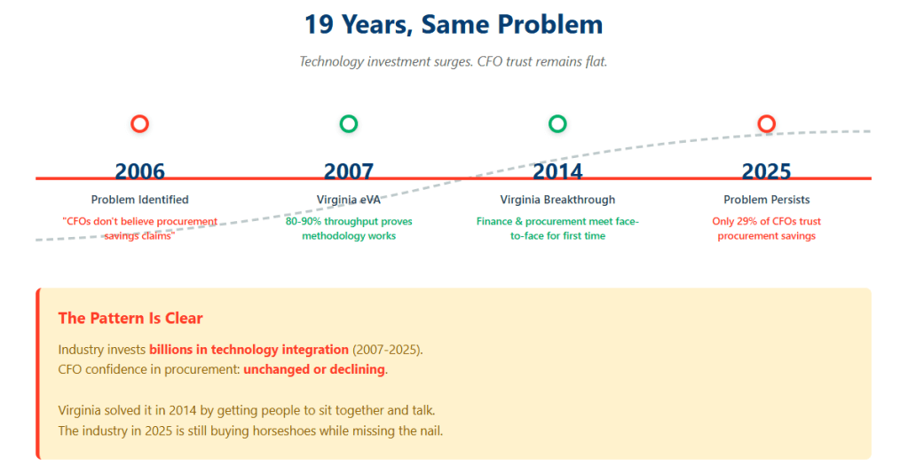 The pattern is clear. The solution has been proven. Yet the industry keeps buying expensive horseshoes while wondering why finance and procurement still don’t trust each other.