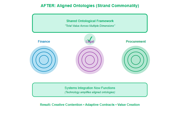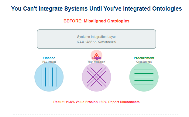 When Spend Matters prescribes “CLM-ERP integration with AI orchestration,” they’re assuming ontological alignment already exists. However, if Legal, Procurement, and Finance operate from incompatible frameworks, integration merely automates confusion more quickly.