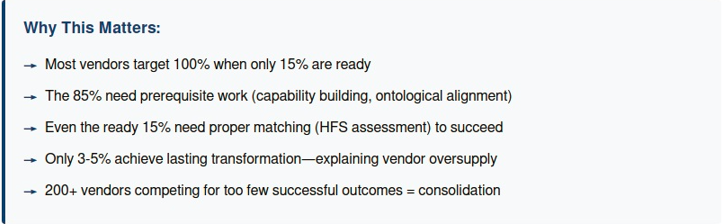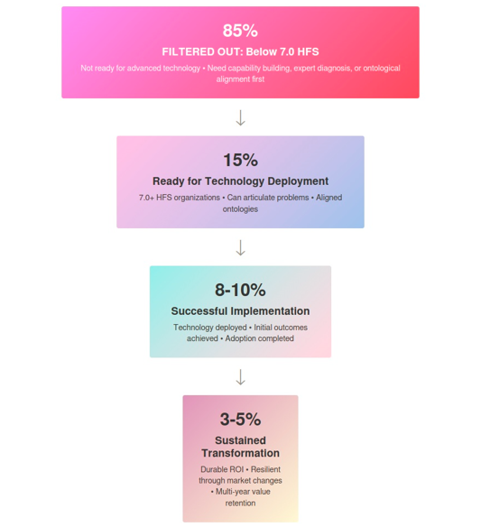 My analysis suggests 12-18% of organizations operate at 7.0+ HFS (sophisticated enough to successfully deploy advanced procurement technology). That means 82-88% of the market isn’t ready for the solutions most vendors are selling.