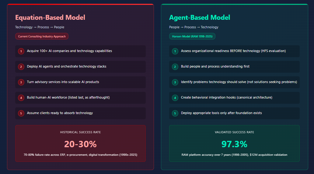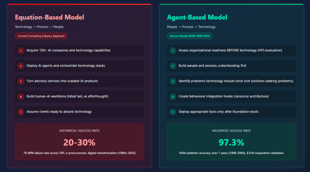 Why the consulting industry’s race to “own the AI stack” ignores 17 years of documented evidence that equation-based transformation has a 70-80% failure rate.