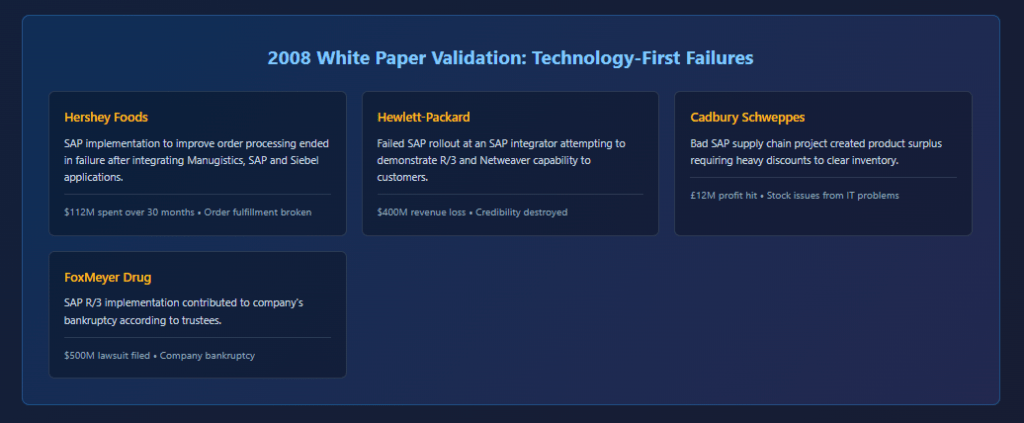 The brutal irony? These failures weren’t caused by bad technology. SAP’s software was (and is) technically sophisticated. The failures happened because consultancies led with technology before assessing organizational readiness.