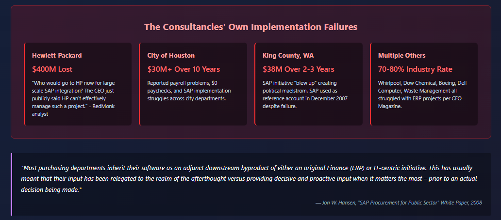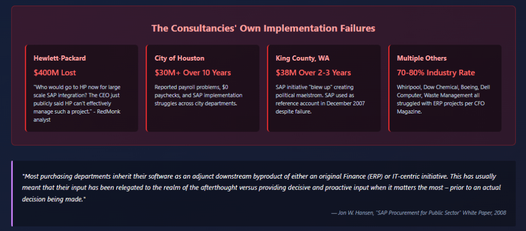 In 2008, I published a white paper for the CATA Alliance titled “SAP Procurement for Public Sector.” The paper analyzed why SAP implementations consistently failed despite the vendor’s technical sophistication and market dominance.
