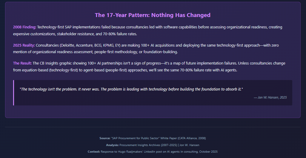 But there’s a critical problem: the consulting industry is repeating the exact same technology-first implementation mistake that has produced 70-80% failure rates for the past three decades—from ERP in the 1990s, to e-procurement in the 2000s, to digital transformation in the 2010s, and now AI/Agentic transformation in the 2020s.
