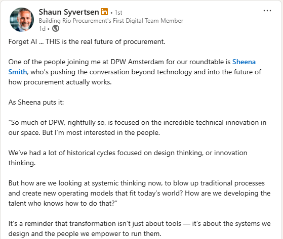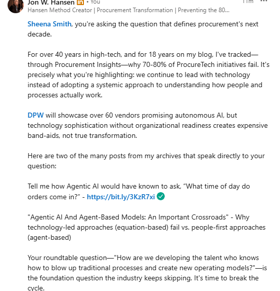 I was invited to participate in this roundtable discussion, but unfortunately, I was unable to attend. However, if you are attending DPW 2025, this should be your first and primary must-attend session because what is being discussed will make the difference between ProcureTech selection and implementation success or failure.