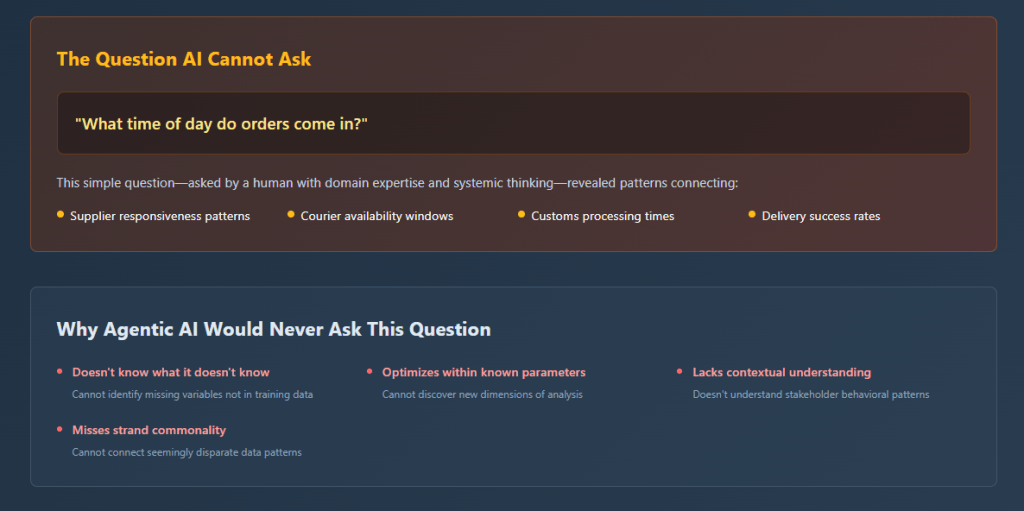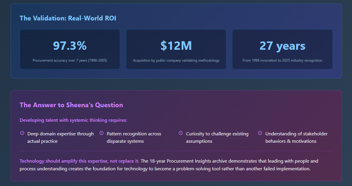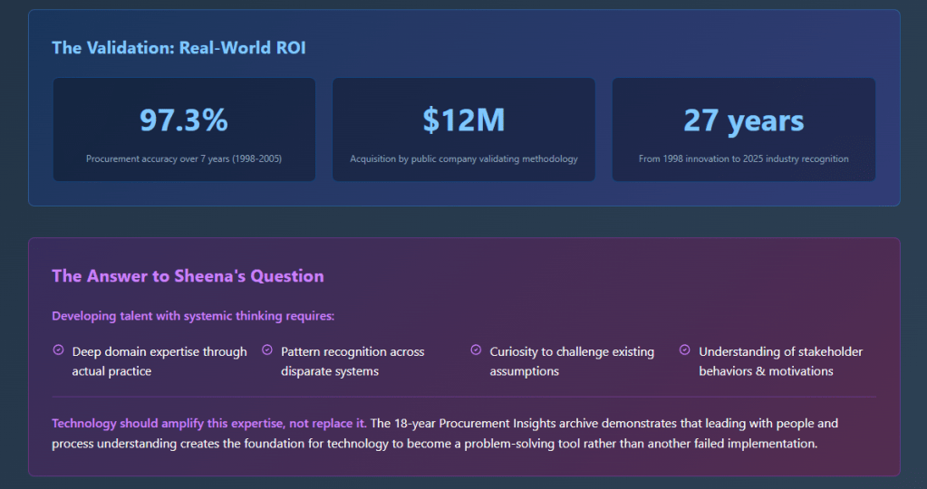 P.S. – The “time of day” insight from 1998 led to 97.3% procurement accuracy over 7 years and a $12M acquisition by a public company. That’s the ROI of developing talent with systemic thinking capabilities.