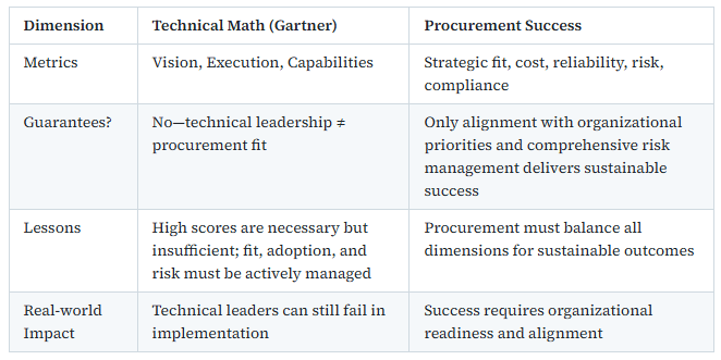 Balanced view: “Math matters—revenue, scale, and execution are proxies for stability, capability and investment potential. But as the Magic Quadrant itself cautions, sustainable success comes from combining strong metrics with vision, customer-centric innovation, and adaptability. The biggest number doesn’t always mean the best fit—especially when the landscape is reshaping itself around AI, agentic models, and hyper-niche solutions.”
