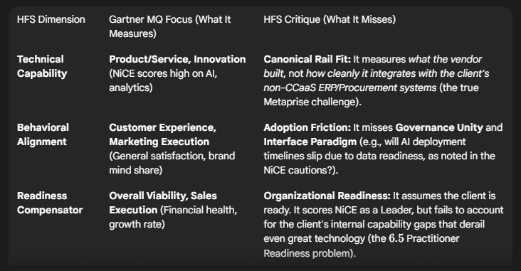 Math helps (Gartner’s data-driven rigor is a baseline), but it’s not the whole equation. NiCE’s leadership reflects technical strength—ideal for large contact centers (e.g., >10K agents)—yet cautions (e.g., support challenges for midsize clients) show fit varies. For procurement, HFS would assess: Technical (8/10 for AI), Behavioral (6.5/10 if adoption lags), Readiness (7/10 if cyber governance is weak)—~70/100, similar to BeNeering. Success lies in aligning these with organizational needs, not just Gartner’s chart. Cyber’s absence from DPW 2025 agendas hints at this disconnect—tech shines, but risks are underplayed.