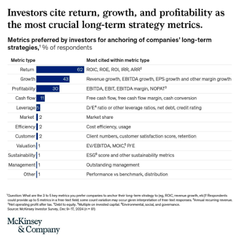 The game has changed. According to McKinsey’s latest investor survey, the capital markets no longer reward technology adoption as success; they anchor long-term strategy to Return (62%), Growth (43%), and Profitability (30%).