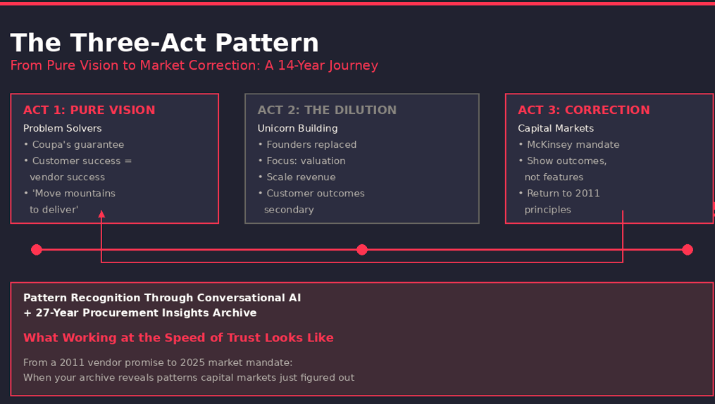 This is what The October Diaries documents: not AI replacing human thinking, but AI amplifying human pattern recognition through 27 years of proprietary archives. The question isn’t whether Coupa succeeded or failed. The question is: can you see the patterns in your own archives that predict where your industry is heading? And more importantly, do you have the conversational AI fluency to find them?