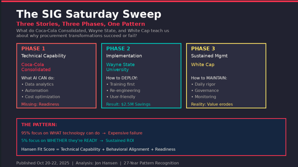 Three articles published in the SIG University series this week (October 20-22, 2025) inadvertently documented the complete lifecycle of procurement transformation – and revealed exactly why fewer than 5% achieve sustained ROI.