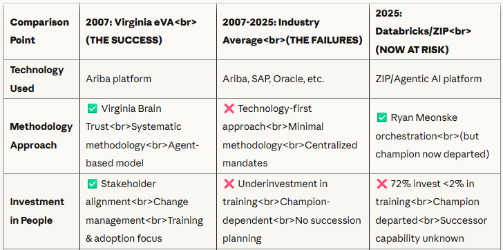 I published an analysis of Ryan Meonske’s departure from Databricks less than a year after their ZIP “success story.” The post questioned whether procurement technology initiatives can survive when the executive champion who orchestrated their success leaves the organization.
