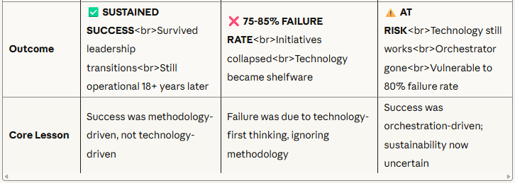 The minute that methodology—or the orchestrator who champions it—departs (as Meonske did), the initiative is vulnerable to falling back into the statistical failure rate, demonstrating that the technology alone cannot sustain the value.