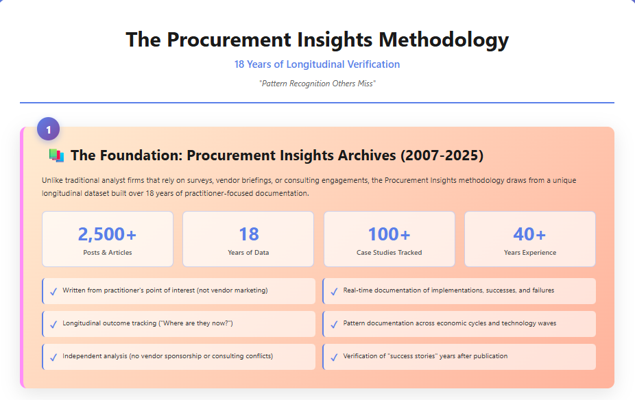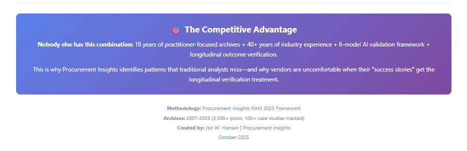 P.S. – If you’re wondering why I’m sharing my methodology so openly: Because I believe the procurement industry needs more rigor and less hype. The Archives exist to document what actually works versus what gets marketed as working. If transparency about my process helps even one practitioner avoid the 80% failure statistic, it’s worth it.