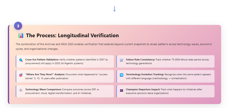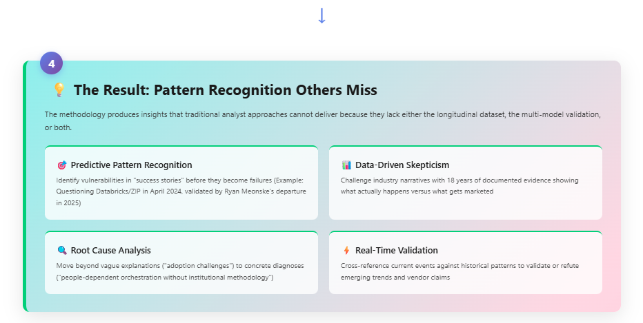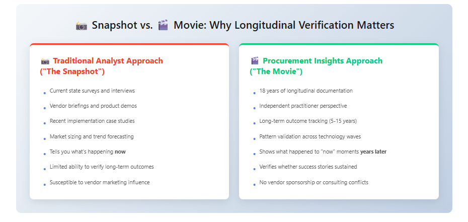 Most analysts can’t make these connections because they don’t have 18 years of practitioner-focused documentation tracking what actually happened to “success stories” after the vendor case studies were published.