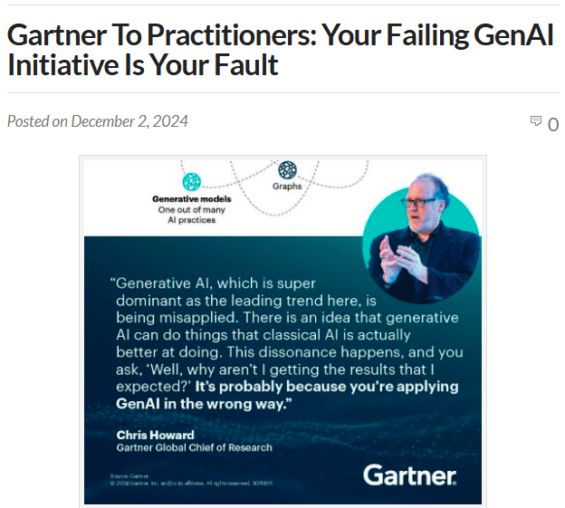 In December 2024, Gartner’s Global Chief of Research basically said to practitioners: ‘Your Failing GenAI Initiative Is Your Fault.’