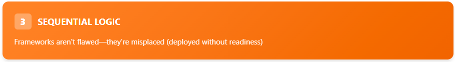 Frameworks are not to blame for being inherently flawed—instead, the issue is timing and sequence. When traditional frameworks are deployed without a preceding, rigorous readiness assessment (such as the Hansen Fit Score), they inevitably assume an organizational capability that is often not present. This results in well-meaning efforts being “driven on the wrong side of the road”: the framework is sound in theory, but the execution environment is fundamentally unready, creating high failure risk.