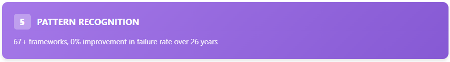 Despite 67+ frameworks being published, the failure rate has remained constant at 70-71% – proving that more frameworks don’t solve the problem.