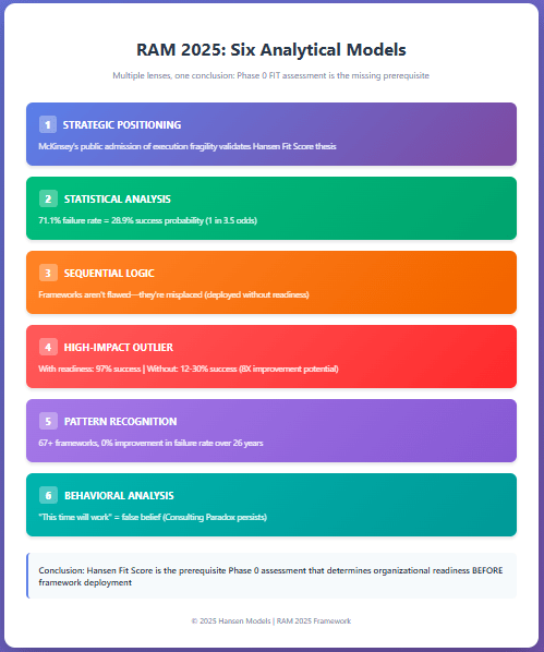 Unless McKinsey’s framework is consciously coupled with a fit assessment before deployment, history and data predict it will struggle to move the needle on failure rates. The strength of the framework isn’t enough—the sequence and organizational readiness are what determine real-world results. The “odds” remain statistically stacked against transformation success unless the readiness gap is closed first.