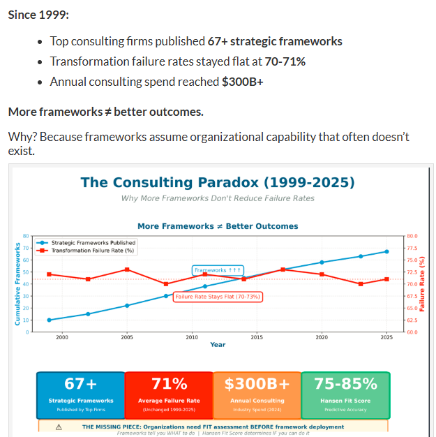 - Despite this massive investment (over $300 billion annually in consulting spend), the transformation failure rate remains stubbornly flat at 70-71%.