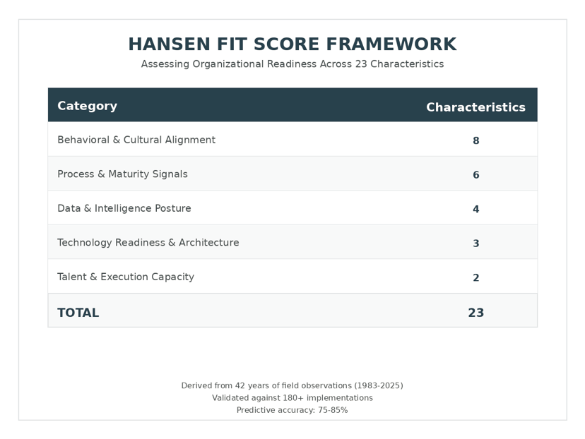 The Hansen Fit Score (HFS) methodology provides this missing layer by offering 75-85% predictive accuracy for implementation success, focusing on the causal factors that the consulting paradox ignores: Incentive Alignment, Process Maturity, and Governance.