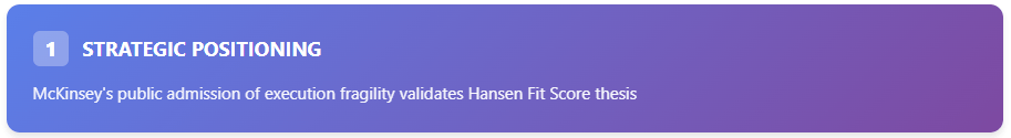 Net effect for Hansen Fit Score (HFS): it validates your thesis in front of the mainstream buyer. If McKinsey says execution readiness is decisive, the market becomes primed for a measurement layer—and HFS is exactly that: a quantified, practitioner-grade fit assessment that predicts survivability and prevents the Evolution Trap. The competitive risks: (1) co-option—McKinsey can rebrand “fit” language without delivering true diagnostics, muddying the term; (2) dilution—“fit” becomes a buzzword checklist instead of a score tied to outcomes; (3) channel power—they can bundle their version of “fit” into large programs, crowding out HFS unless you differentiate clearly as the independent, go/no-go measurement, not another framework. Strategy to counter: own “FIT = measured, predictive readiness,” publish the 23 characteristics openly enough to anchor the standard, and position HFS as the prerequisite that even McKinsey’s blocks must pass before deployment.