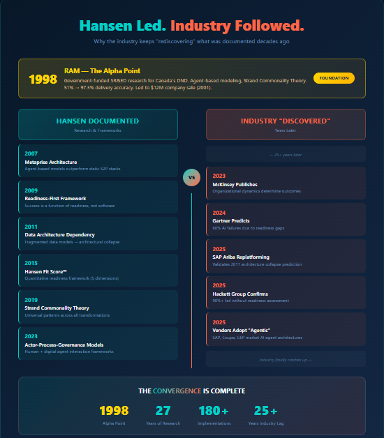 The ideas the industry is now calling “next-gen procurement” — agentic workflows, data-centric architectures, readiness-anchored transformation — are not new. They’re what I documented across 27 years of research.