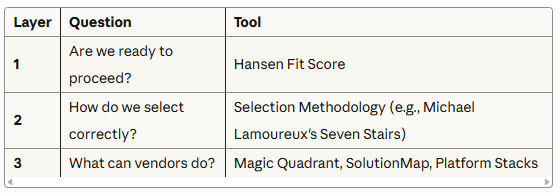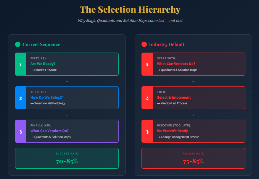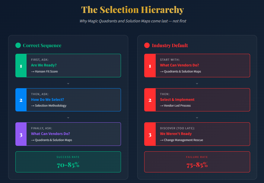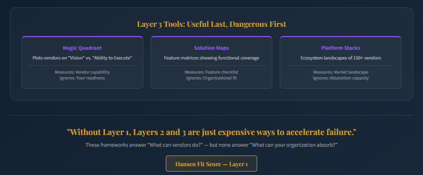 What it ignores: Fit. A vendor that covers every box but doesn’t match your organizational maturity, process complexity, or behavioral readiness will still fail. The matrix assumes the organization is a neutral recipient of capability. It isn’t.