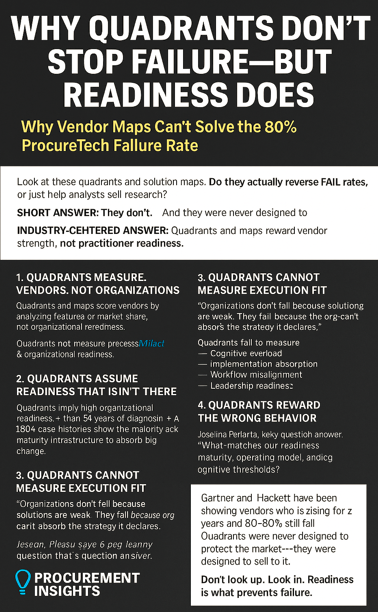 What it ignores: Whether your organization can absorb, adopt, or sustain the platform. Coupa’s Leader status tells you nothing about whether an organization scoring 58/100 on readiness can successfully implement it.