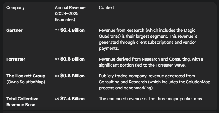The total annual revenue for the companies most closely associated with the proprietary reports is in the tens of billions: