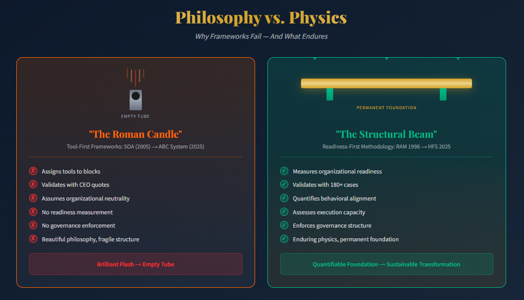 However, my assessment, rooted in 27 years of tracking transformation success, views this framework with deep skepticism. This approach, while well-intended, risks becoming another “roman candle flare”—a brilliant flash of light that leaves behind an “empty, burnt out tube of vaporized thinking”.
