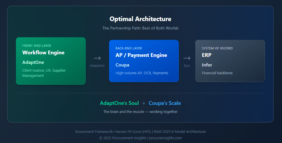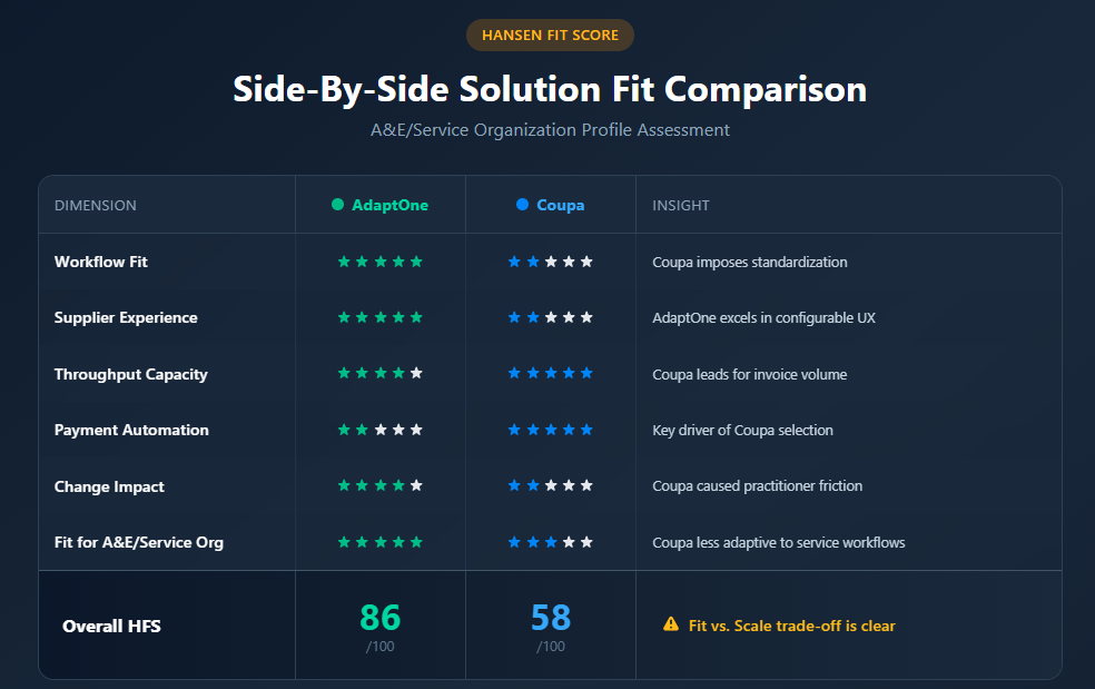 The firm selected Coupa, a well-known enterprise procurement platform. Coupa offered what AdaptOne did not: immediate payment automation, e-payables, and a powerful AP engine capable of industrial-scale invoice processing.