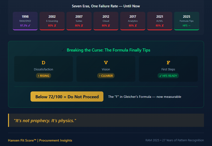 - 2012: Cloud Era — SaaS platforms would transform procurement. 80% failure rate.