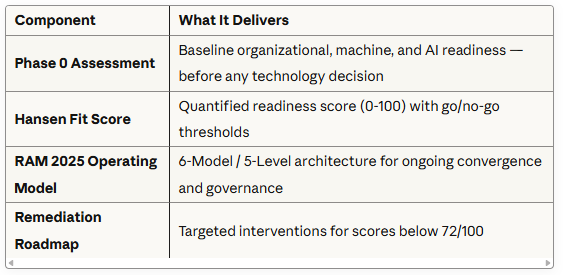 Unified Readiness™ — a single assessment framework for human, process, and machine alignment.