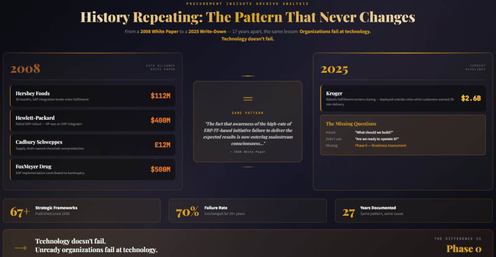 Jon Hansen has been documenting procurement transformation patterns since 1998. His work on the Hansen Fit Score methodology addresses the organizational readiness gap that underlies the documented 70-80% failure rate in technology implementations. The Procurement Insights archives contain over 3,500 posts spanning 2007-2025, providing institutional memory of what happened to “success stories” after the press releases stopped.