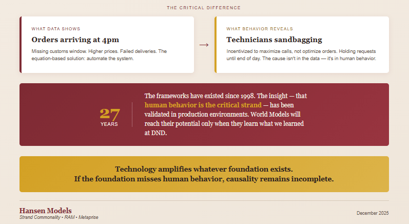 Technology amplifies whatever foundation exists. If the foundation is purely data-driven, you get sophisticated pattern matching. If the foundation includes behavioral agents — the humans whose decisions actually drive outcomes — you get something that works.